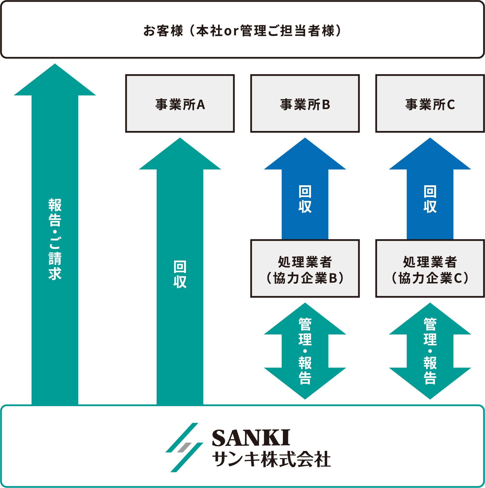 複数の事業所をお持ちのお客様に対して、各エリアごとに廃棄物の管理サービスも行っております。